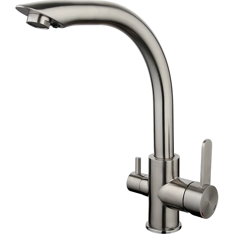 Смеситель для кухни Gappo G4399 с краном для питьевой воды.Характеристики: Цвет: нержавеющая сталь. Материал: нержавеющая сталь. Механизм: керамический картридж 35 мм. Управление: однорычажное. Излив: поворотный, с каналом для питьевой воды. Тип подводки: гибкая. Монтаж: на мойку. Отверстий для монтажа: 1. Аэратор. Тип крепления: гайка. В комплекте поставки: Смеситель. Гибкая подводка. Комплект креплений.