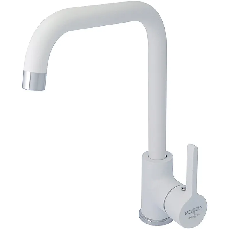 Смеситель для кухни Melodia della vita Ostessa MDV35115_wt — это стильное и функциональное решение для вашей кухни. Кухонный смеситель с поворотным изливом в белом и хромированном исполнении станет не только практичным, но и эстетичным дополнением интерьера.