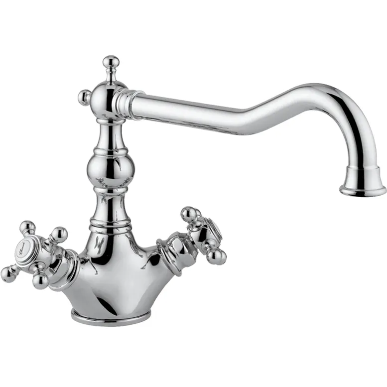- Эстетичный дизайн: Глянцевая поверхность и крестообразные металлические ручки придают смесителю стильный ретро-вид.