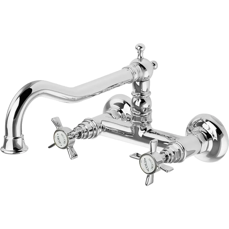 Смеситель для кухни Migliore Princeton 18247.Характеристики: Цвет: хром. Материал: латунь. Поворотный излив. Управление: двухвентильное. Механизм: керамическая кран-букса. Монтаж: на стену. Отверстия для монтажа: 2. Стандарт подводки: G 1/2. С аэратором. Совместимость с проточным водонагревателем. Защита от обратного потока. В комплекте поставки: Смеситель.