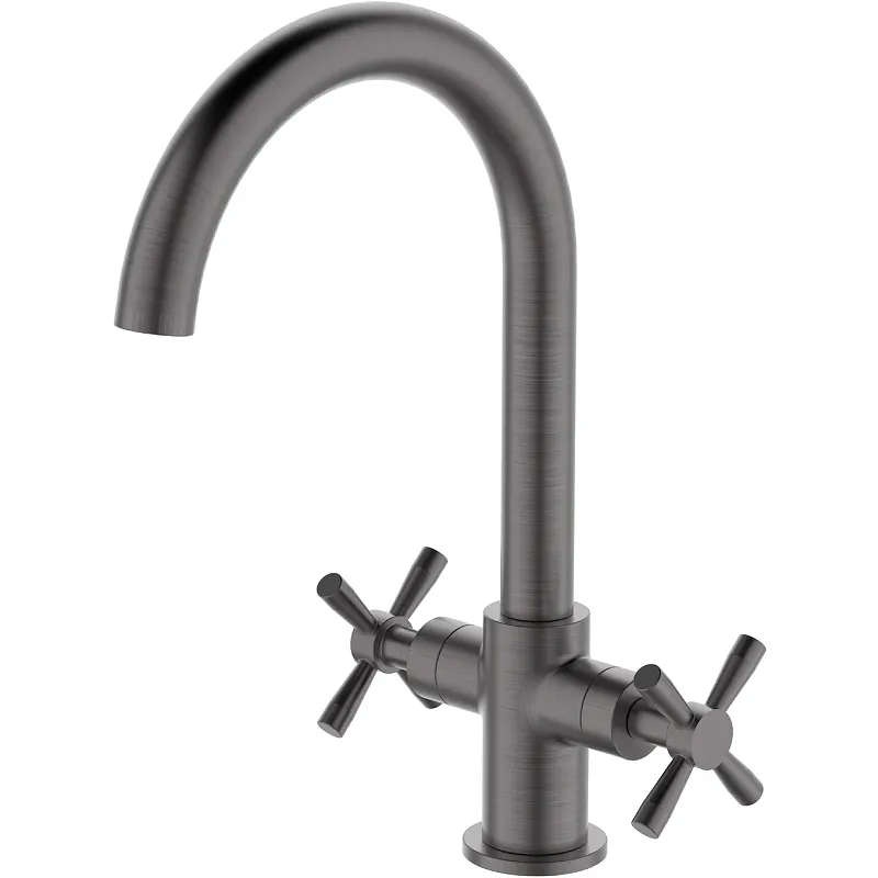 Смеситель для кухни Orange Mia M34-821Gr двухзахватный.Смеситель с поворотным изливом в цвете графит, крепится на сантехнику, идеально подходит для любых кухонных комнат в современном стиле. Качественные материалы, которые используются для производства, устойчивы к коррозии и перепадам температур. Керамическая кран-букса позволит Вам плавно регулировать поток воды и температуру, это достаточно удобно в повседневном использовании.Характеристики:Механизм работы: керамическая кран-букса.Стандарт подключения: G1/2.Крепление: на сантехнику.Цвет: графит.Материал: высокопрочная латунь.Стиль: современный.В комплекте поставки: смеситель.