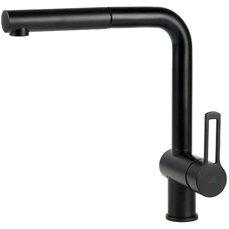 Смеситель для кухни Paffoni Ringo RIN295NO.Характеристики: Цвет: черный матовый. Материал: латунь. Управление: однорычажное. Вращение излива: поворотный, вытяжной. Механизм: керамический картридж. Стандарт подключения: 1/2. Тип подводки: гибкая. Монтаж: на мойку. Отверстие для монтажа: 1. С подключением для фильтра. В комплекте поставки: Смеситель.