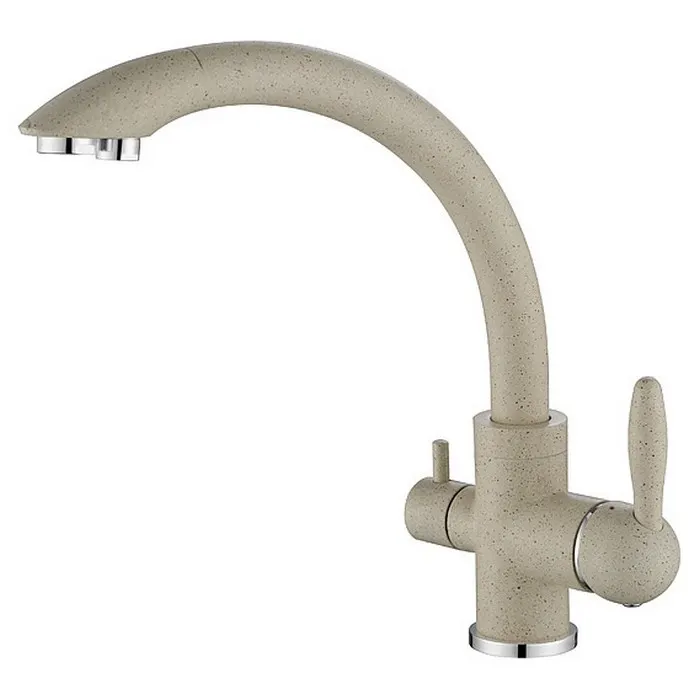 Однорычажный смеситель для кухонной мойки Paulmark Essen Es213001-328. Цвет: бежевый.Универсальный дизайн изделия дополнит большинство кухонь в современном стиле. Оснащен дополнительным краном с подключением фильтра питьевой воды.Изготовлен из высококачественной латуни с многослойным и стойким к истиранию покрытием.Керамический картридж Paulmark 35 мм с ресурсом открываний/закрываний в 500 000 раз обеспечивает точную настройку температуры и напора воды.Излив с поворотом на 360 градусов и отдельным каналом для потока фильтрованной воды.Съемный пластиковый аэратор Caskad с защитой от известковых отложений делает струю мягкой, ровной и экономичной.Гибкая подводка в оплетке из нержавеющей стали длиной 40 см, G 1/2.Простой и быстрый монтаж.В комплекте поставки: смеситель для кухни, гибкая подводка, усиленное крепление, переходник для подключения фильтра.