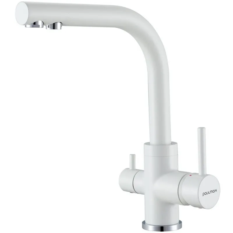 Смеситель для кухонной мойки Paulmark Essen Es213011-431TW. Цвет: белый матовый.Универсальный дизайн изделия дополнит большинство кухонь в современном стиле. Оснащен дополнительным краном с подключением фильтра питьевой воды.Изготовлен из высококачественной латуни с многослойным и стойким к истиранию покрытием. Керамический картридж Paulmark 35 мм с ресурсом открываний/закрываний в 500 000 раз обеспечивает точную настройку температуры и напора воды. Излив с поворотом на 360 градусов и отдельным каналом для потока фильтрованной воды. Съемный пластиковый аэратор Caskad с защитой от известковых отложений делает струю мягкой, ровной и экономичной. Гибкая подводка в оплетке из нержавеющей стали длиной 40 см, G 1/2. Простой и быстрый монтаж. В комплекте поставки: смеситель для кухни, гибкая подводка, усиленное крепление, переходник для подключения фильтра.