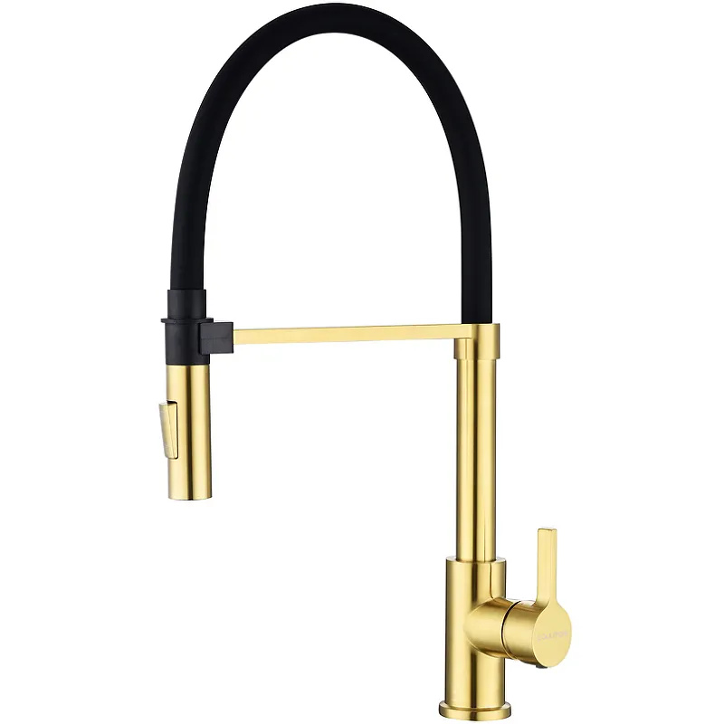 Смеситель для кухни Paulmark Halt Ha214021-BG.Характеристики: Цвет: брашированное золото. Материал: латунь, силикон. Управление: рычажное. Механизм: керамический картридж. Излив: поворотный на 360 градусов, гибкий. 2 режима подачи воды: мощная струя / деликатный душ. Крепление гибкого излива с помощью магнитного держателя. Тип подводки: гибкая. Стандарт подводки: 1/2. Отверстия для монтажа: 1. Монтаж: на мойку / на столешницу. В комплекте поставки: Смеситель. Подводка. Комплект креплений.