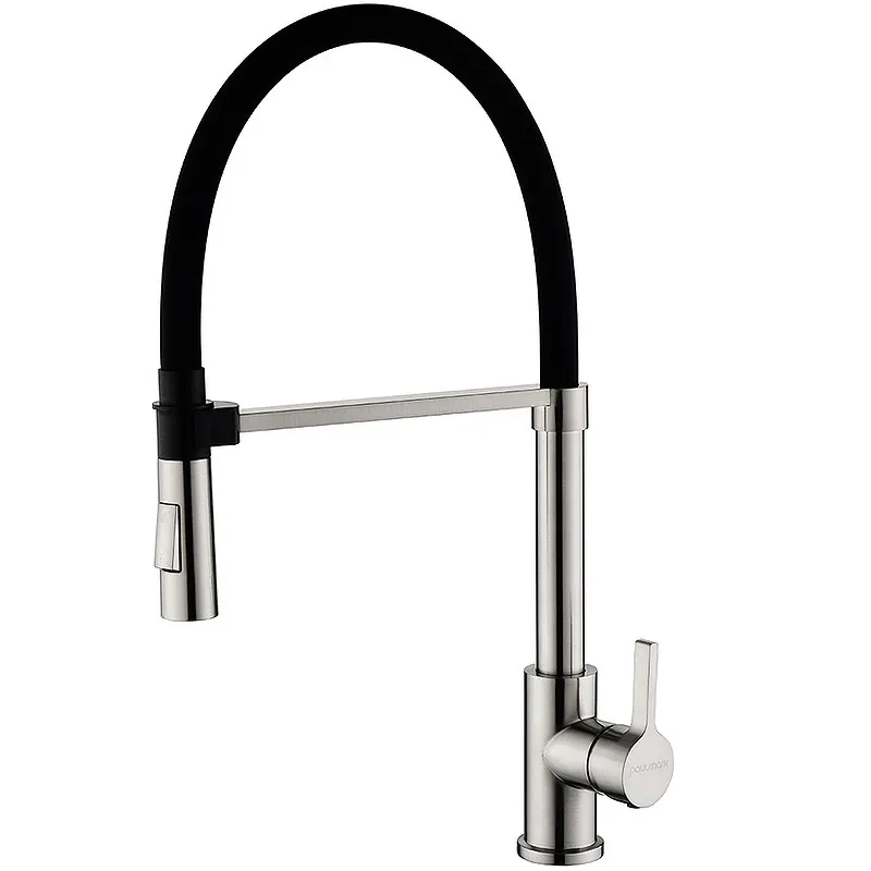 Смеситель для кухни Paulmark Halt Ha214021-Ni. Изготовлен из высококачественной латуни, которая отвечает высочайшим европейским стандартам качества, не содержит свинца, не разрушается со временем и безопасна для здоровья. Характеристики: Цвет: никель. Гибкий излив из силикона. Два режима подачи воды: струя/душ. Неприхотлив в обращении и уходе. Долговечный керамический картридж диаметром 40 см. Надежная фиксация излива с помощью магнитного держателя. Смеситель прост в подключении. Поворотный излив. В комплекте поставки: смеситель; гибкая подводка 40 см; усиленный комплект креплений.