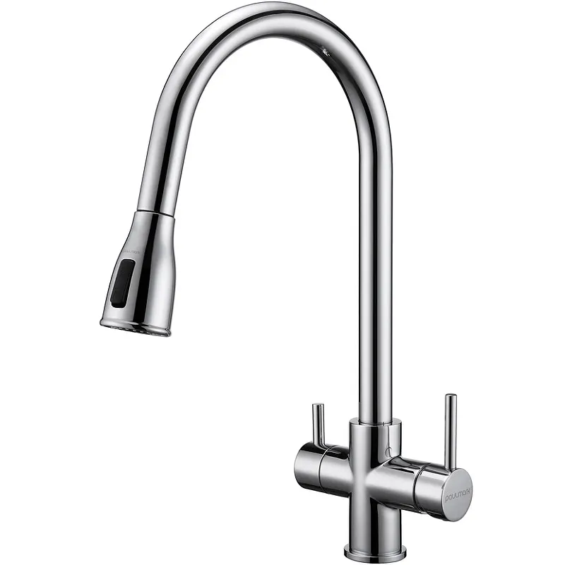Смеситель для кухни Paulmark Lange La214212-CR.Характеристики: Цвет: хром. Материал: латунь. Управление: рычажное. Механизм: керамический картридж. Отдельный канал для питьевой воды. Отдельная ручка управление открытием потока питьевой воды. Вытяжной шланг с режимом струи душ. Высокий поворотный излив, вращение на 180 градусов. Аэратор. Тип подводки: гибкая. Стандарт подводки: 1/2. Отверстия для монтажа: 1. Монтаж: на мойку / на столешницу. В комплекте поставки: Смеситель. Гибкая подводка из нержавеющей стали. Усиленный комплект креплений. Запасной аэратор.