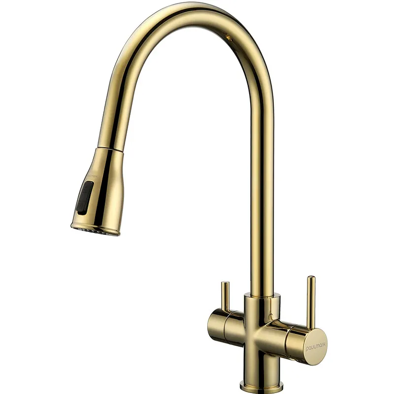 - Смеситель для кухни золото: Элегантный золотой цвет добавляет роскоши и изысканности вашему интерьеру.