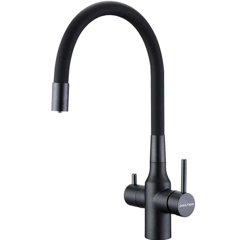 Смеситель для кухни Paulmark Salix Sa213419-418.Характеристики: Цвет: черный металлик. Материал: латунь, силикон. Управление: рычажное. Механизм: керамический картридж. Отдельный канал для питьевой воды. Отдельная ручка управление открытием потока питьевой воды. Гибкий излив с фиксацией обеспечивает оптимальный диапазон движения. Высокий поворотный излив, вращение на 360 градусов. Аэратор. Тип подводки: гибкая. Стандарт подводки: 1/2. Отверстия для монтажа: 1. Монтаж: на мойку / на столешницу. В комплекте поставки: Смеситель. Подводка.