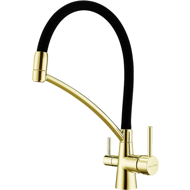 Смеситель для кухни Paulmark Siegen Si213111-SBG.Смеситель для кухни с возможностью подключения фильтра Siegen изготовлен из высококачественной латуни, которая отвечает высочайшим европейским стандартам качества, не содержит свинца, не разрушается со временем и безопасна для здоровья.Гибкий излив из силикона с возможностью вращения на 360 градусов обеспечивает оптимальный диапазон движения и удобство использования.Конструктивная технология Trinkwasser предусматривает поступление фильтрованной воды, которая не смешивается с водопроводной. Фильтрованная вода подается через отдельный канал, а для регулирования предусмотрена отдельная ручка.Благодаря долговечному керамическому картриджу диаметром 35 мм, смеситель прослужит многие годы. А съемный пластиковый аэратор обеспечивает мягкую струю, ровный и экономичный поток воды.Характеристики: Цвет: светлое брашированное золото. Материал: латунь, силикон. Управление: рычажное. Механизм: керамический картридж 35 мм. Излив: гибкий, поворотный. Поворот излива 360 градусов. Аэратор с функцией экономии расхода воды. Возможность подключения системы фильтрации питьевой воды. Гибкая подводка в оплётке из нейлоновой нити 40 см. Стандарт подводки: G1/2. Монтаж: на мойку, на столешницу. В комплекте поставки: Смеситель. Гибкая подводка. Усиленный комплект креплений. Выход для подключения системы фильтрации питьевой воды. Переходник цанга для подключения системы фильтрации питьевой воды.