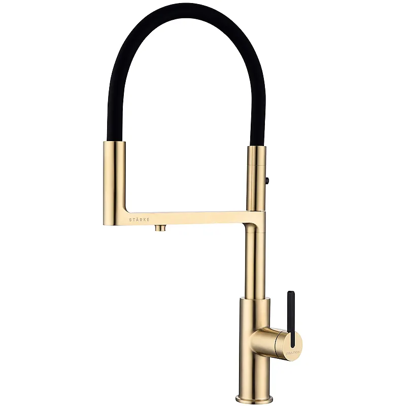 - Современный дизайн смесителя для кухни: Стильный внешний вид в светлом брашированном золоте подходит для любой кухни.