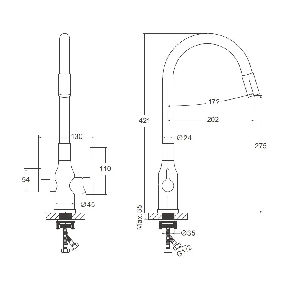 В комплекте с смесителем идёт гибкая подводка (M10*1-G1/2) длиной 45 см, что обеспечивает удобство монтажа и подключения к системе водоснабжения. Монтаж осуществляется при помощи гайки, что делает процесс установки простым и быстрым.