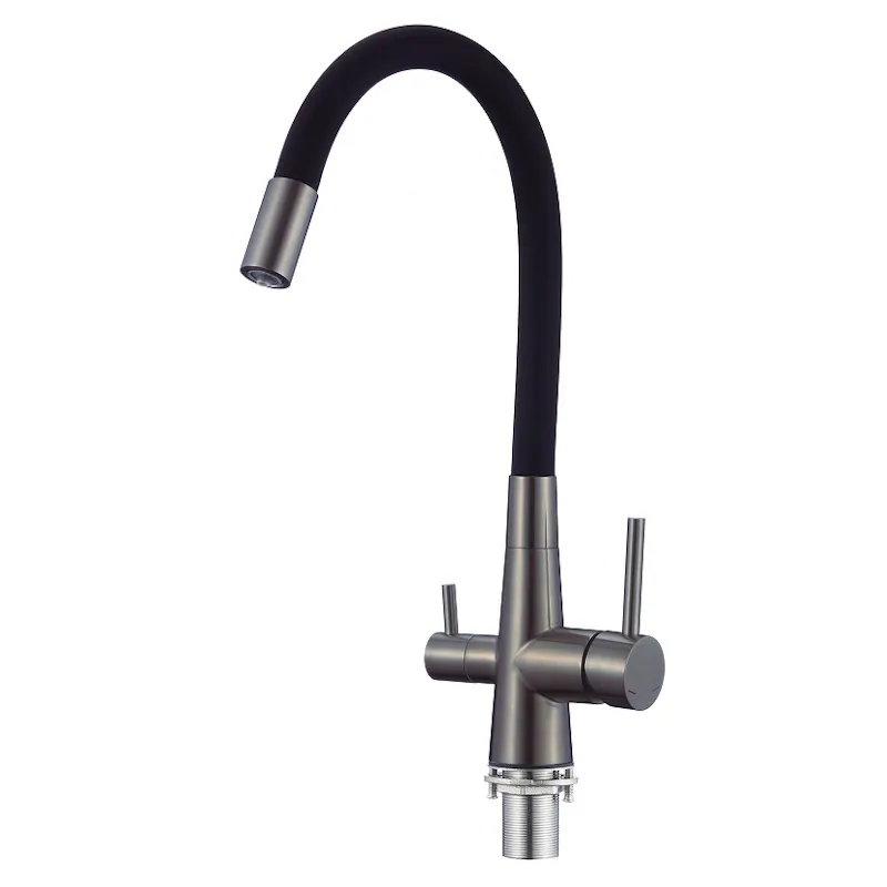 Обновите кухонное пространство с смесителем "Coral", выполненным из высококачественной латуни в изысканном графитовом ("оружейная сталь") и черном цветах. Гибкий излив длиной 52 см и надежный стандартный аэратор обеспечивают максимальное удобство. Возможность подключения к фильтровой системе добавляет функциональности, а стильный дизайн делает этот смеситель настоящим акцентом вашей кухни! Гибкий поворотный излив позволяет удобно мыть посуду и наполнять большие кастрюли и чайники. Также с гибкий излив очень удобен при чистке и ополаскивании кухонной мойки. Встроенный канал для питьевой воды облегчает процесс фильтрации и подачи чистой воды. Теперь у вас всегда будет доступ к чистой и свежей воде прямо из вашей мойки. Отдельный рычаг для подачи чистой воды от фильтра: подключается через отдельный шланг к системе фильтрации водопроводной воды, например марки Гейзер, Барьер и другие. Фильтр приобретается отдельно.