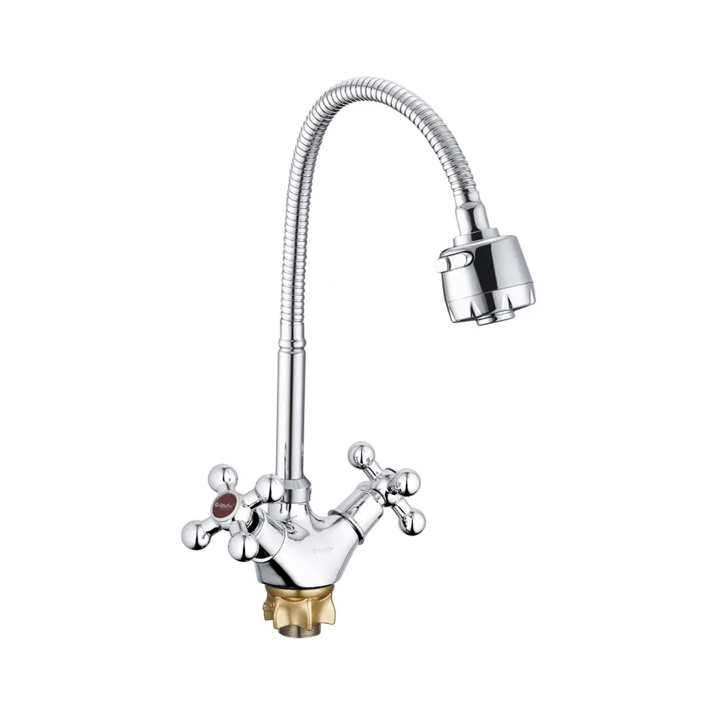 Смеситель для кухни с гибким изливом и режимом "душ" G.Lauf QTZ4-E856. Цвет: хром. Поверхность: глянцевая. Материал: латунь. Гарантийный срок: 3 года. Стилистика дизайна ретро. Монтаж: на мойку;на столешницу. Управление: вентильное. Вращение излива: да. Выдвижной излив: нет. Гибкий излиа: да. Режим душ излива: да. Стандарт подводки: 1/2".