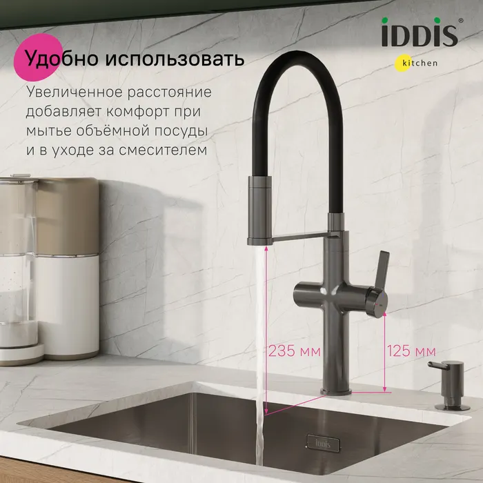 Смеситель для кухни с каналом для фильтрованной воды и гибким изливом IDDIS Ikon графит арт-IKNGMFFi05