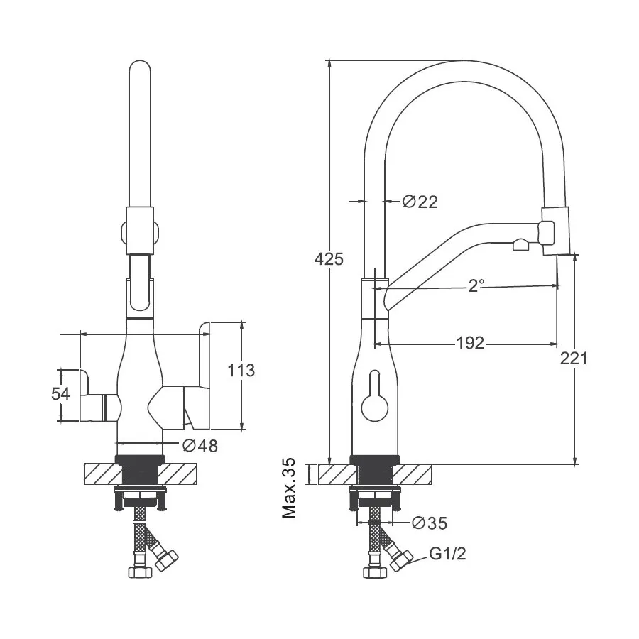 В комплекте с смесителем идёт гибкая подводка (M10*1-G1/2) длиной 45 см, что обеспечивает удобство монтажа и подключения к системе водоснабжения. Монтаж осуществляется при помощи гайки, что делает процесс установки простым и быстрым.