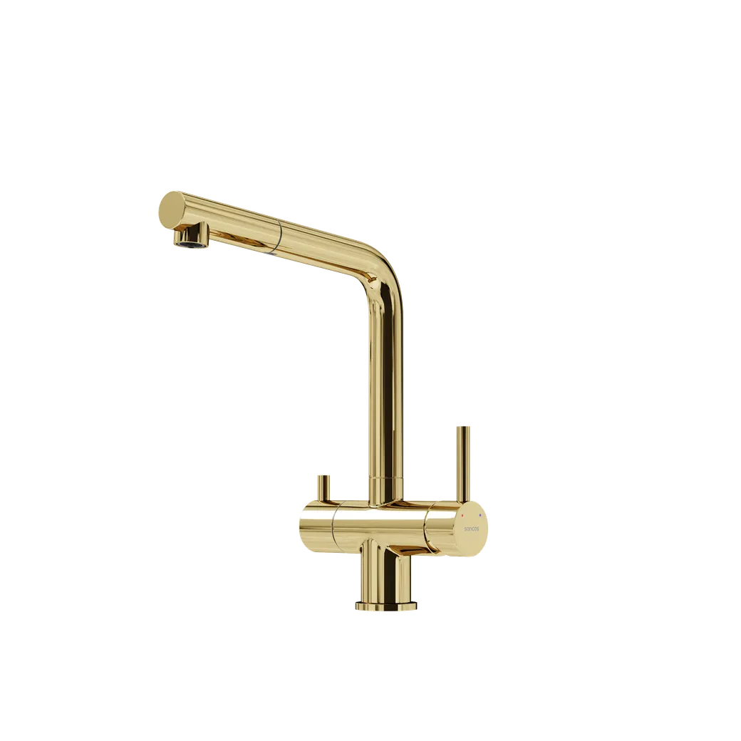 Смеситель для кухни SANCOS Spin с поворотным и вытяжным изливом, c краном для фильтрованной воды, цвет полированное золото, арт. арт-SC4015ZG