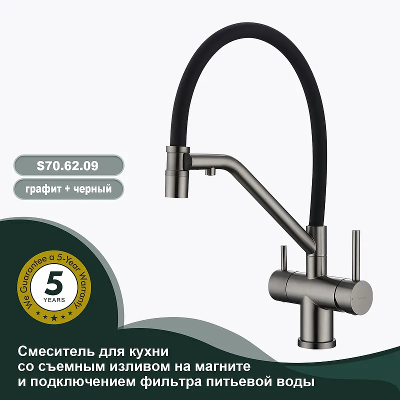 Смеситель для кухни Splenka S70.62.09 является идеальным решением для современной кухни. Этот однорычажный смеситель с графитово-матовым и черным покрытием не только стильный, но и функциональный. Изготовленный из латуни, он оснащен керамическим картриджем, что обеспечивает долговечность и надежность. Благодаря съемному изливу с магнитным креплением и каналу для питьевой воды, он предоставляет два режима подачи воды: струя и деликатный душ.