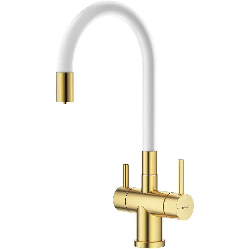 Смеситель для кухни Splenka S70.64.03.Характеристики: Цвет корпуса: золото матовое. Цвет излива: белый. Материал: латунь. Управление: однорычажное. Механизм: керамический картридж. Излив: поворотный (угол поворота 360 градусов), гибкий, с каналом для питьевой воды. Аэратор. Стандарт подводки: G 1/2. Тип подводки: гибкая. Отверстия для монтажа: 1. Монтаж: на мойку / на столешницу. В комплекте поставки: Смеситель для кухни. Гибкая подводка. Комплект креплений.