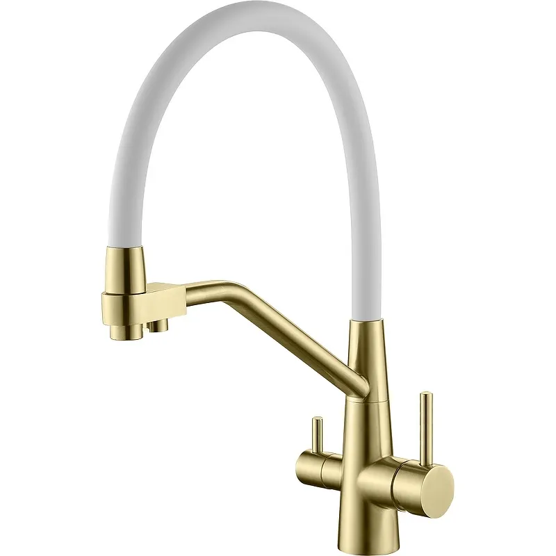 - Современный дизайн: Смеситель для кухни имеет стильный матовый золотой корпус, который гармонично сочетается с белым изливом, добавляя элегантности.