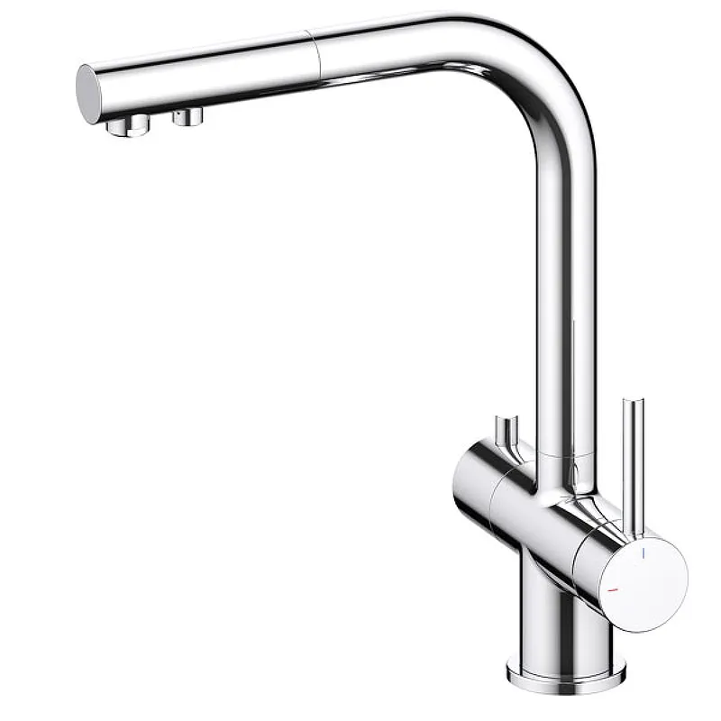 Смеситель для кухни Saona 2356/00FL с рычагом для фильтрованной воды и выдвижным изливом.Технические данные:Цвет: хром. Материал: латунь. Поворотный, выдвижной излив с аэратором. Керамический вентиль 1/2. Отдельные водотоки для питьевой и водопроводной воды. Стандарт подводки: G 3/8. Монтаж: на столешницу.