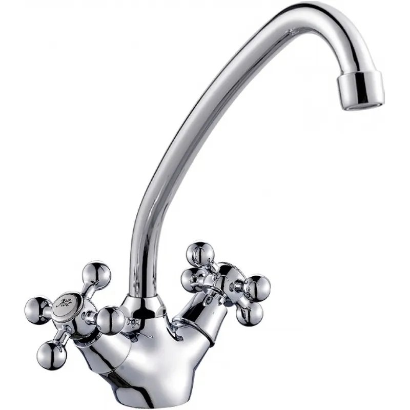 Двухвентильный смеситель для кухни Viko V-1203.Характеристики: Цвет: хром. Материал: силумин. Механизм: керамические кран-буксы. Управление: вентильное. Излив: поворотный. Стандарт подводки: G 1/2. Тип подводки: гибкая. Тип крепления: шпилька. Монтаж: на мойку. В комплекте поставки: смеситель для кухни.
