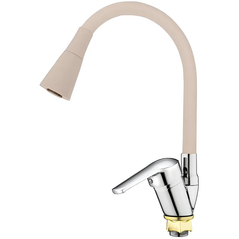 Смеситель для кухни Viko V-3514 с гибким изливом.Характеристики: Цвет: хром, песочный. Материал: латунь. Керамический картридж. Управление: однорычажное. Гибкий излив. Монтаж: на мойку. Две функции струи. Стандарт подводки: G 1/2. Тип подводки: гибкая. Крепление: латунная гайка. В комплекте поставки: Смеситель. Гибкая подводка. Крепление.