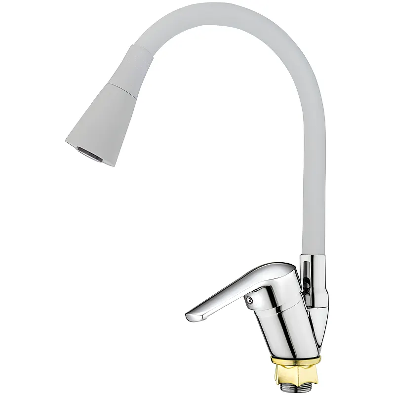Смеситель для кухни Viko V-3544 с гибким изливом.Характеристики: Цвет: хром, белый. Материал: латунь. Керамический картридж. Управление: однорычажное. Гибкий излив. Монтаж: на мойку. Две функции струи. Стандарт подводки: G 1/2. Тип подводки: гибкая. Крепление: латунная гайка. В комплекте поставки: Смеситель. Гибкая подводка. Крепление.