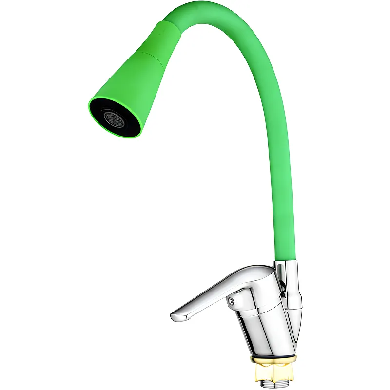 Смеситель для кухни Viko V-3594 с гибким изливом.Характеристики: Цвет: хром, зеленый. Материал: латунь. Керамический картридж. Управление: однорычажное. Гибкий излив. Монтаж: на мойку. Две функции струи. Стандарт подводки: G 1/2. Тип подводки: гибкая. Крепление: латунная гайка. В комплекте поставки: Смеситель. Гибкая подводка. Крепление.