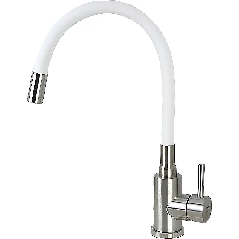 Смеситель для кухни Viko V-4448 с гибким изливом.Характеристики: Цвет: нержавеющая сталь, белый. Материал: нержавеющая сталь. Керамический картридж. Управление: однорычажное. Поворотный гибкий излив. Монтаж: на мойку, на столешницу. Стандарт подводки: G 1/2. Тип подводки: гибкая. Крепление: гайка из нержавеющей стали. В комплекте поставки: Смеситель. Гибкая подводка. Крепление.