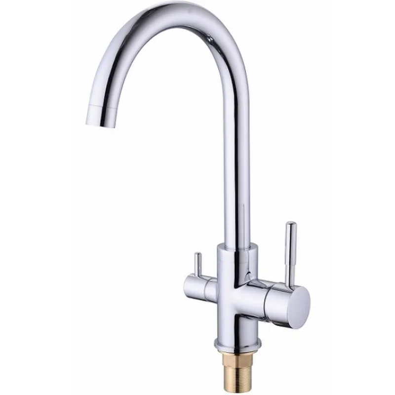Смеситель для кухни Viko V-5104 с краном для питьевой воды.Характеристики: Цвет: хром. Материал: латунь. Механизм: керамический картридж. Управление: рычажное. Излив: поворотный, с каналом для питьевой воды. Стандарт подводки: G 1/2. Тип подводки: гибкая. Тип крепления: гайка латунная. Монтаж: на мойку, на столешницу. В комплекте поставки: смеситель для кухни.