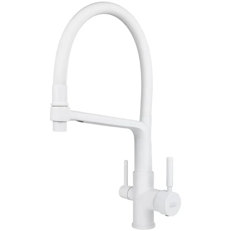 Смеситель для кухни Viko V-5604 с краном для питьевой воды.Характеристики: Цвет: белый матовый. Материал: латунь. Управление: рычажное. Излив: поворотный, гибкий, с каналом для питьевой воды. Механизм: керамический картридж. Стандарт подводки: G 1/2. Тип подводки: гибкая. Монтаж: на мойку, на столешницу. В комплекте поставки: Смеситель для кухни. Гибкая подводка. Аэратор. Паспорт.