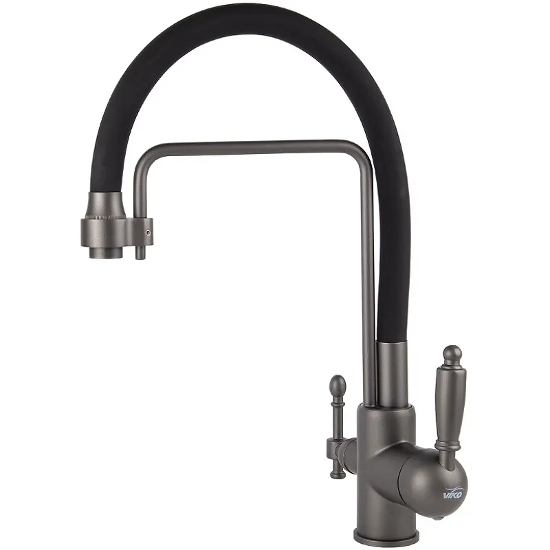 Смеситель для кухни Viko V-5617 с краном для питьевой воды.Характеристики: Цвет: графит, черный. Материал: латунь. Управление: рычажное. Излив: поворотный, гибкий, с каналом для питьевой воды. Механизм: керамический картридж. Стандарт подводки: G 1/2. Тип подводки: гибкая. Монтаж: на мойку, на столешницу. В комплекте поставки: Смеситель для кухни. Гибкая подводка. Аэратор. Паспорт.