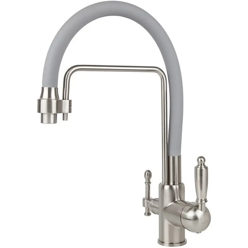 Смеситель для кухни Viko V-5618 с краном для питьевой воды.Характеристики: Цвет: серебро, серый. Материал: латунь. Управление: рычажное. Излив: поворотный, гибкий, с каналом для питьевой воды. Механизм: керамический картридж. Стандарт подводки: G 1/2. Тип подводки: гибкая. Монтаж: на мойку, на столешницу. В комплекте поставки: Смеситель для кухни. Гибкая подводка. Аэратор. Паспорт.