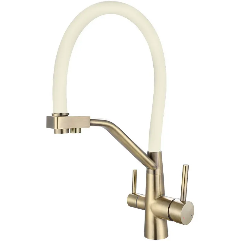 Смеситель для кухни Viko V-5832 с краном для питьевой воды.Характеристики: Цвет: бронза, белый. Материал: латунь. Управление: рычажное. Излив: поворотный, гибкий, с каналом для питьевой воды. Механизм: керамический картридж. Стандарт подводки: G 1/2. Тип подводки: гибкая. Монтаж: на мойку, на столешницу. В комплекте поставки: Смеситель для кухни. Гибкая подводка. Аэратор. Паспорт.