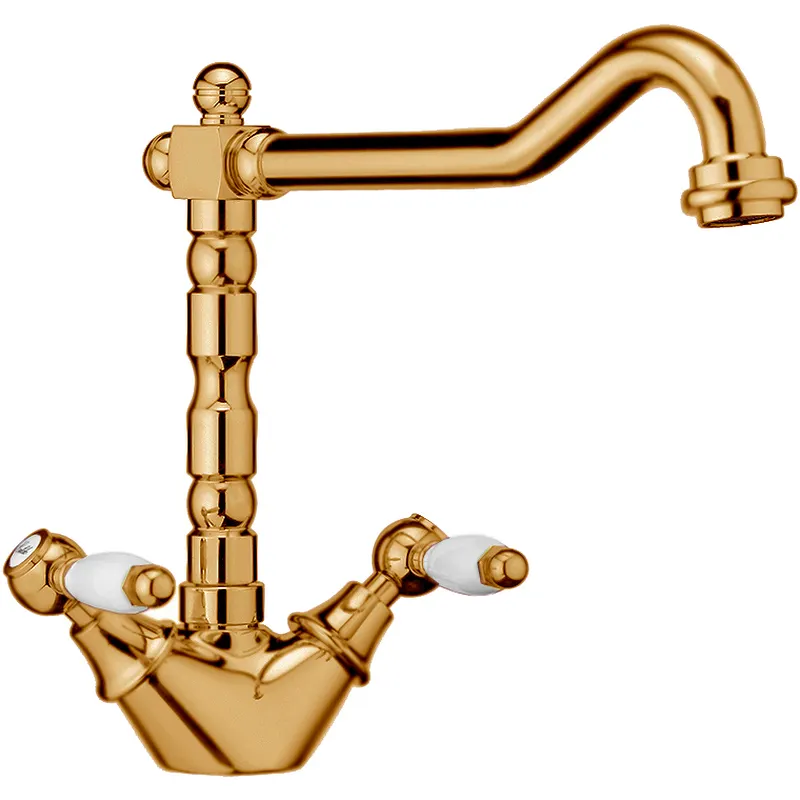 Смеситель для кухни Webert Kitchen Dorian DO780102065.Характеристики: Цвет: бронза. Цвет ручек: белый. Материал: латунь. Материал ручек: термопластичная резина. Тип управления: вентильное. Механизм: керамическая кран-букса. Cтандарт подводки: 1/2. Монтаж: на мойку. Излив: поворотный. Тип подводки: гибкая подводка. В комплекте поставки: Смеситель. Гибкая подводка.