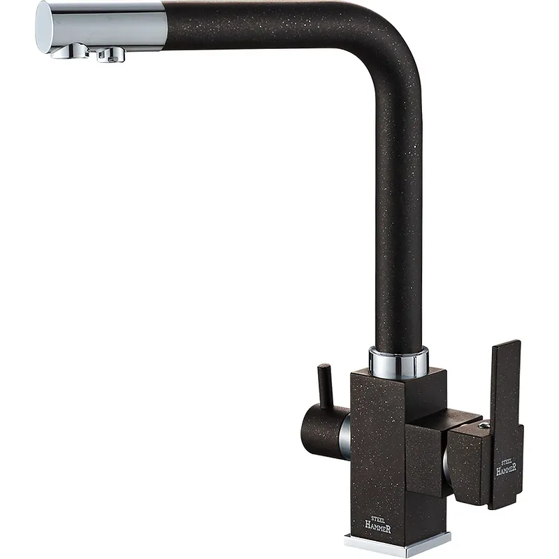 Смеситель для кухни ZorG Steel Hammer SH 805 BLACK CR с краном для питьевой воды.Характеристики: Цвет: черный матовый, хром. Покрытие: гранит матовый. Материал: латунь. Механизм: керамический картридж. Управление: однорычажное. Излив: поворотный, с каналом для питьевой воды. Стандарт подводки: 1/2. Тип подводки: гибкая. Монтаж: на мойку, на столешницу. Отверстий для монтажа: 1. Аэратор. Универсальное цанговое подключение к фильтру. В комплекте поставки: Смеситель. Гибкая подводка 45 см. Комплект креплений. Переходник-цанга для подключения фильтра.