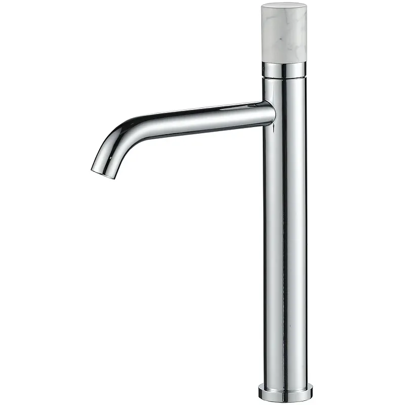 - Элегантный дизайн: Хромированная поверхность и натуральный камень на ручке придают смесителю стильный и современный вид.