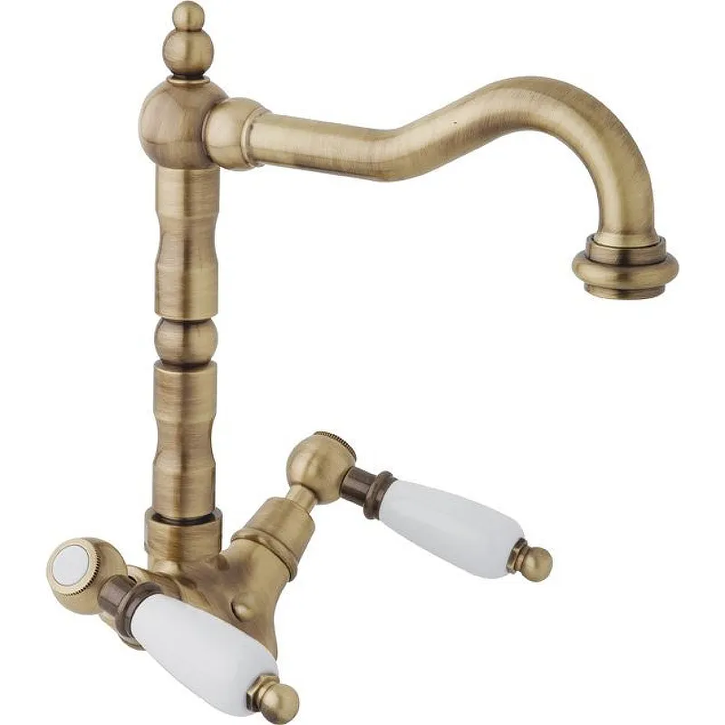 Смеситель для раковины Cezares First-LS2-02-Bi.Двухвентильный смеситель с поворотным изливом и аэратором, монтируемый в одно отверстие. Имеет долгий срок эксплуатации за счет качественных деталей, неприхотлив в уходе. Станет прекрасным дополнением ванной комнаты в классическом или ретро стиле.Характеристики: Цвет корпуса: бронза. Цвет ручек: белый. Материал: латунь. Управление: вентильное. Механизм: керамическая кран-букса. Отверстия для монтажа: 1 отверстие. Рабочий интервал давления в водопроводной сети: 0,5-6 Атм. С аэратором. Тип подводки: гибкая. Стандарт подключения: G 1/2. В комплекте поставки: Смеситель. Донный клапан. Гибкая подводка. Крепления.