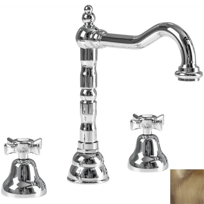 Смеситель для раковины Cezares Golf BLS2-02. Артикул: GOLF-BLS2-02. Поможет в создании изысканного классического или ретро стиля Вашей ванной комнаты. Цвет: бронза. Материал: высококачественный латунный сплав, который обеспечивает прочность, устойчивость к влаге и температурным перепадам. Удобные крестообразные вентили позволяют точно регулировать температуру и напор воды. Керамические кран-буксы. Поворотный излив с аэратором. Удобный в обращении штоковый донный клапан G 1 1/4. Стандарт подключения: G 1/2. Монтаж: на 3 отверстия. В комплекте поставки: смеситель, гибкая подводка, донный клапан.