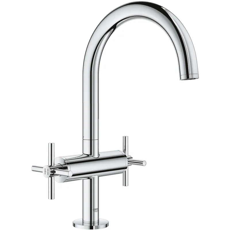 Смеситель для раковины Grohe Atrio 21019003.Характеристики: Цвет: хром. Материал: латунь. Технология Grohe Long-Life Shine: стойкий сверкающий блеск. Крестообразные рукоятки. Управление: вентильное. Излив: поворотный со стопором. Механизм: керамические вентили 1/2, 90 градусов. Стандарт подводки: 3/8. Тип подводки: гибкая. Grohe Water Saving 5.7 л/мин водосберегающий ламинарный аэратор. Нажимной донный клапан 1 1/4. Grohe FastFixation быстрая монтажная система. Монтаж: на раковину. В комплекте поставки: Смеситель для раковины. Гибкая подводка. Аэратор. Донный клапан. Два набора с накладными насадками: один с надписями H (hot, горячая) и C (cold, холодная), другой - без надписей.