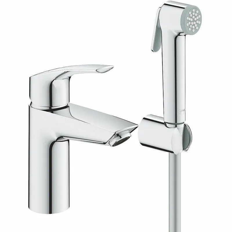 Смеситель для раковины Grohe Eurosmart 23124003 с гигиеническим душем.Характеристики: Цвет: хром. Материал: латунь. Стойкое долговечное хромированное покрытие Grohe Long-Life Finish. Металлический рычаг. Управление: однорычажное. Излив: фиксированный. Механизм: керамический картридж Grohe SilkMove 28 мм. Регулировка расхода воды. Ограничитель температуры. Grohe Water Saving ограничитель расхода воды 5.7 л/мин. Цепочка. Grohe FastFixation быстрая монтажная система. Стандарт подводки: 3/8. Тип подводки: гибкая. Монтаж: на раковину. В комплекте поставки: Смеситель для раковины. Гибкая подводка. Аэратор. Гигиенический душ со встроенным переключателем. Настенный держатель душа. Душевой шланг.