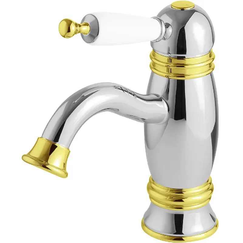 Смеситель для раковины Migliore Oxford 19159.Станет изящным украшением Вашей ванной комнаты. Поможет в создании оригинального и функционального дизайна помещения в классическом или ретро стиле. Отличается плавными изгибами корпуса и утонченной ручкой смесителя.Характеристики: Цвет: хром золото. Материал: латунь. Высококачественный латунный сплав, который обеспечивает прочность, устойчивость к влаге и температурным перепадам. Специальное лаковое покрытие защищает внешнюю часть смесителя от быстрого износа. Однорычажная система управления. Утонченная ручка выполнена в белом цвете. Керамический картридж. Фиксированный излив с аэратором. Стандарт подключения: G 1/2. Монтаж: на 1 отверстие. Защита от обратного потока. Совместимость с проточным водонагревателем. В комплекте поставки: Смеситель.Гибкая подводка.