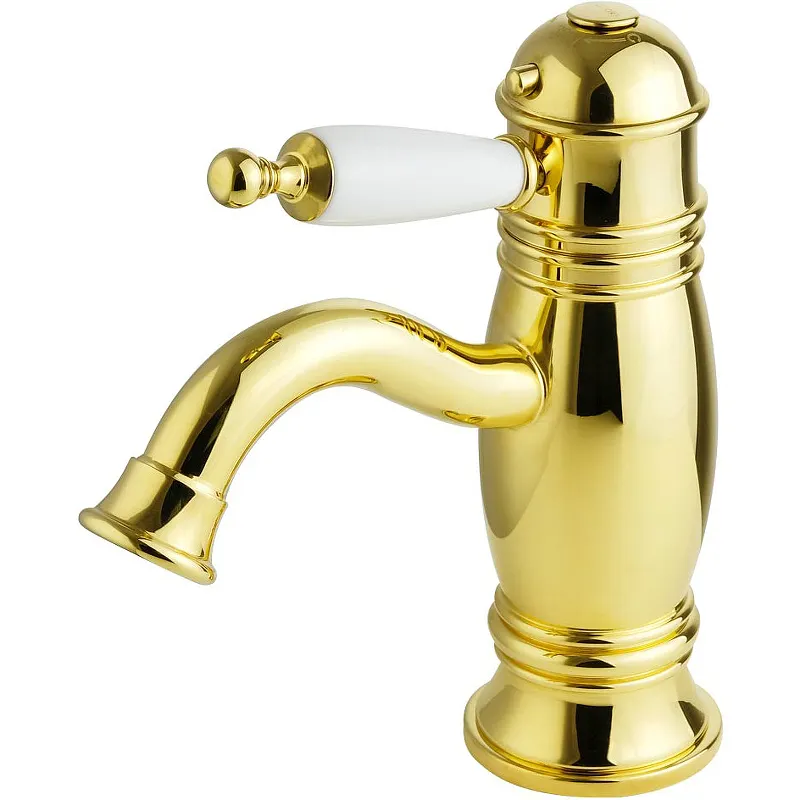 - Элегантный дизайн: Смеситель для раковины в золотом цвете с белой ручкой станет ярким акцентом в интерьере.