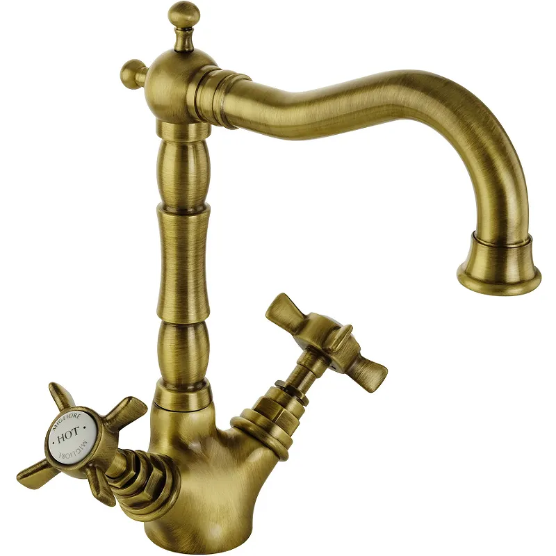 Смеситель для раковины Migliore Princeton 19349.Характеристики: Цвет: бронза. Материал: латунь. Поворотный излив. Управление: двухвентильное. Механизм: керамическая кран-букса. Монтаж: на раковину. Отверстия для монтажа: 1. Стандарт подводки: G 1/2. С аэратором. Совместимость с проточным водонагревателем. Защита от обратного потока. В комплекте поставки: Смеситель. Гибкая подводка. Крепления.