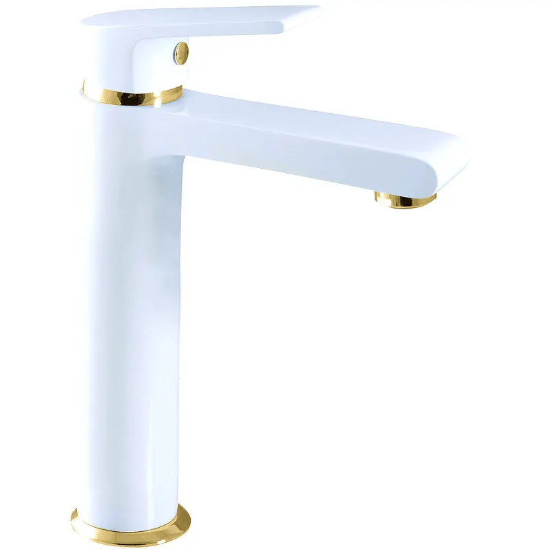 - Элегантный дизайн: Современный смеситель для раковины прекрасно впишется в интерьер благодаря белому и золотому цвету.