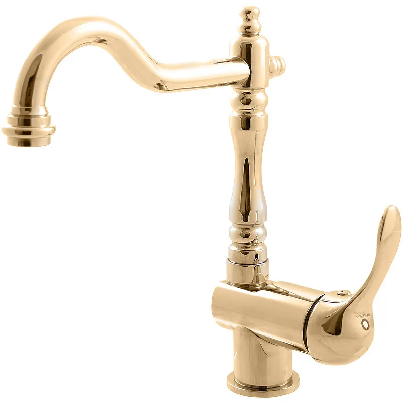 Смеситель для раковины Rav Slezak Labe L008.5/8Z.Характеристики: Цвет: золото. Материал: латунь. Управление: однорычажный. Поворотный излив, 360 градусов. Механизм: керамический картридж 35 мм Kerox. С аэратором. Стандарт подводки: G1/2. Отверстия для монтажа: 1. Монтаж: на раковину. В комплекте поставки: Смеситель. Гибкая подводка, длиной 35 см. Крепления.