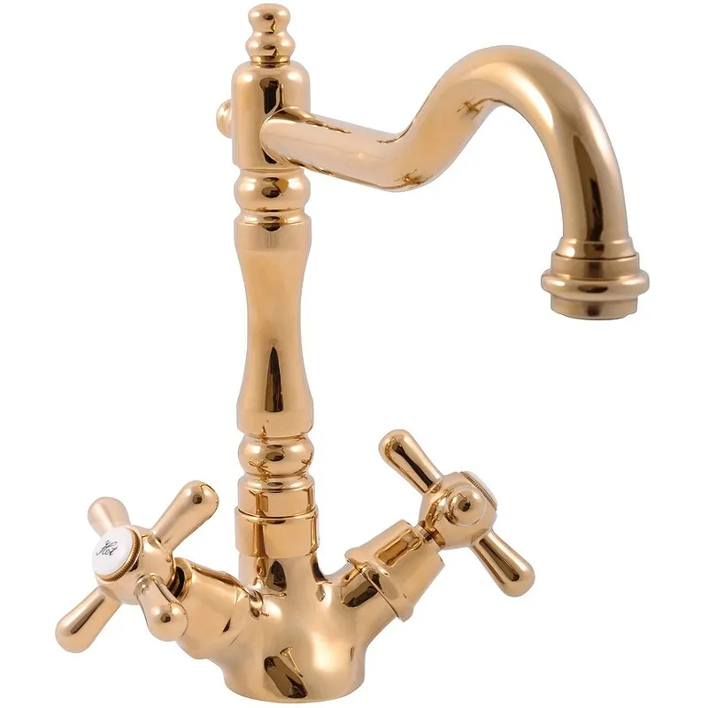 Смеситель для раковины Rav Slezak Morava retro MK120.5/8Z.Характеристики: Цвет: золото. Материал: латунь. Механизм: керамическая кран-букса. Управление: двухвентильное. Излив: поворотный. Аэратор. Стандарт подводки: 1/2. Тип подводки: гибкая. Отверстия для монтажа: 1. Монтаж: на раковину. В комплекте поставки: Смеситель. Инструкция.