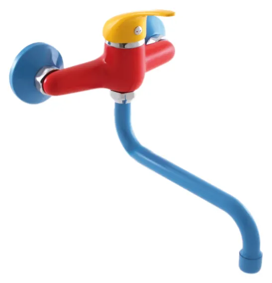 - Яркий и стильный внешний вид: Смеситель для раковины в красном с желтым и синим цветах станет ярким акцентом в интерьере.