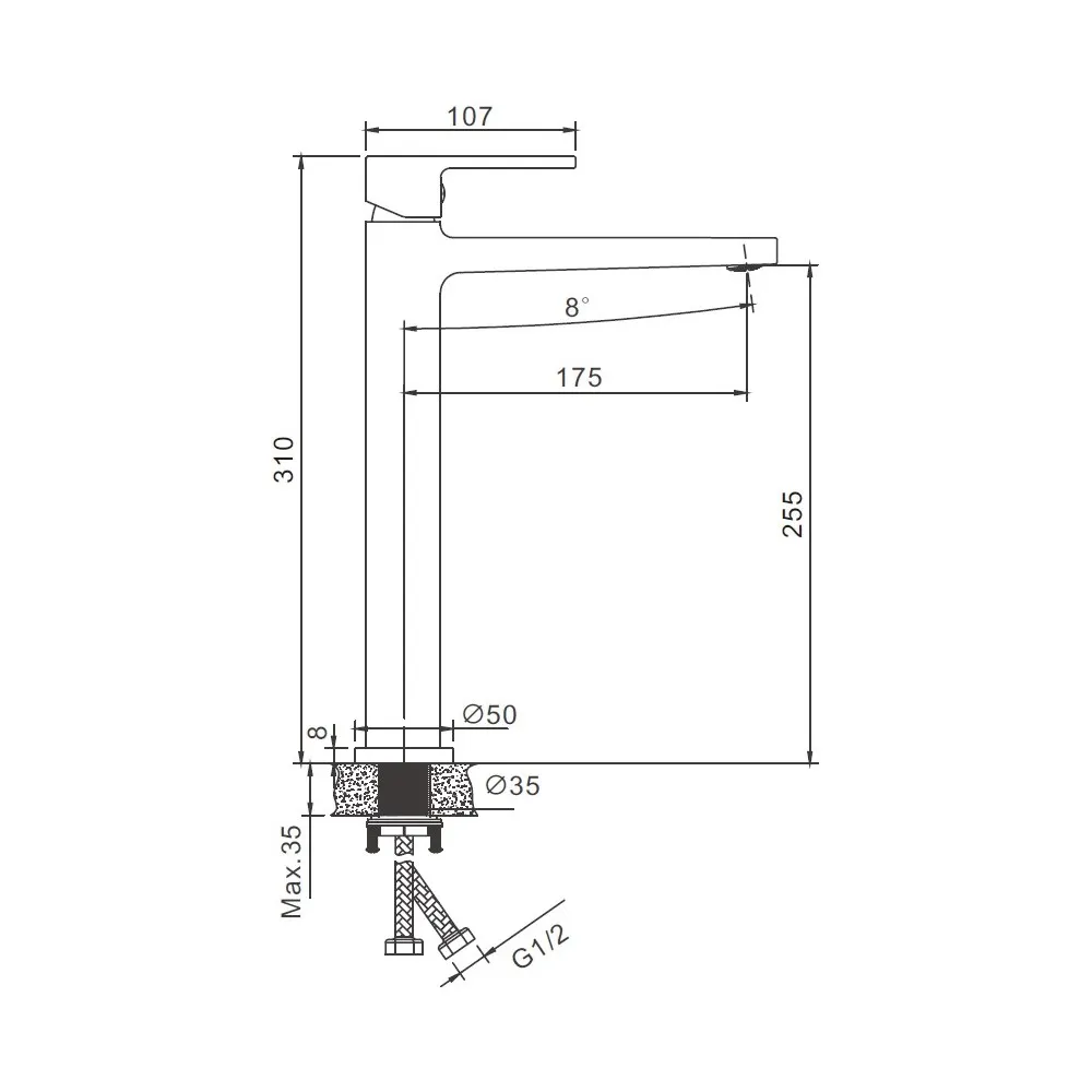 Рычажное управление обеспечивает удобство и простоту использования, а керамический картридж диаметром 26 мм гарантирует плавное и точное регулирование потока воды. Фиксированный излив смесителя оснащён аэратором, который делает струю воды более мягкой и равномерной. Максимальная толщина установки составляет 35 мм, а крепление осуществляется при помощи гайки, что обеспечивает надёжную фиксацию. Гибкая подводка длиной 45 см (M10*1-G1/2) упрощает процесс монтажа и подключения к водопроводной системе. На смеситель BELZ предоставляется гарантия 5 лет, что подтверждает его высокое качество и надёжность.